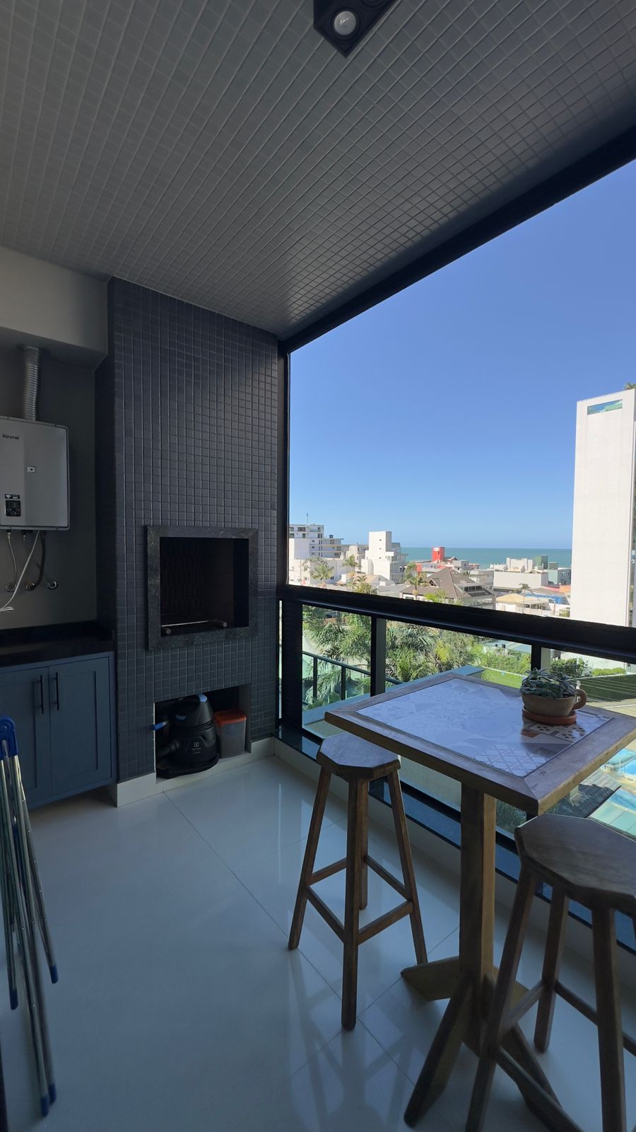 Sacada com churrasqueira a carvão e vista mar